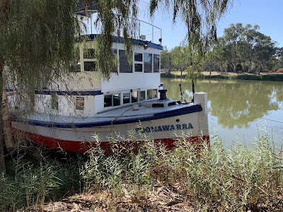Standing on the Mildura Wharf took this photo looking up river. That houseboat tied to a tree could be a private one or a rental.